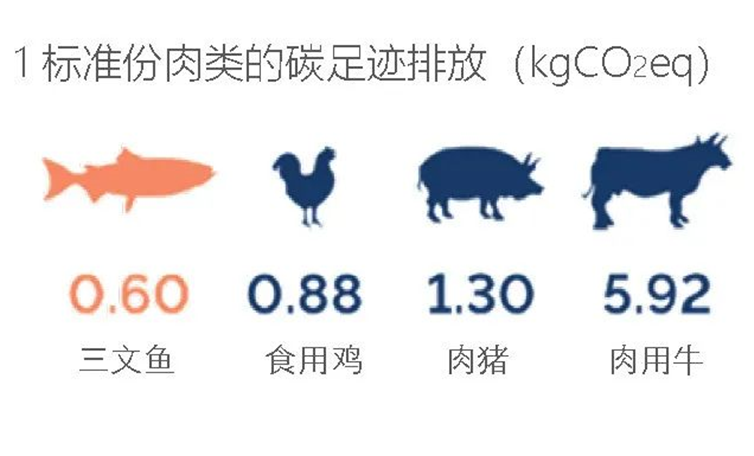 與牛肉和豬肉相比,三文魚的二氧化碳排放量較低。因此,相比其他養殖產業,三文魚養殖更是一個資源節約型的養殖產業。