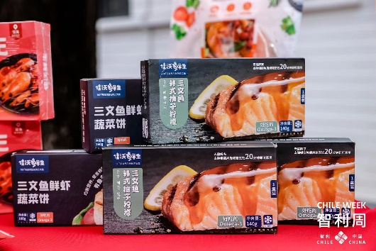 三文魚作為智利的代表名片之一,在重磅的智利周開幕式上屢被提及。佳沃食品也攜旗下品牌饞熊同學和佳沃鮮生,在智利周開幕式的展會現場亮相,為嘉賓們展示了來自智利的三文魚加工產品,成為整個展區的亮點所在。