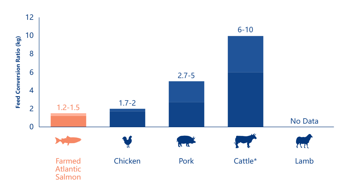 與其他常見畜牧類相比,三文魚的飼料轉(zhuǎn)化率 (FCR) 均表現(xiàn)優(yōu)良,業(yè)內(nèi)平均在1.2-1.5之間,即投入1.2-1.5kg 飼料,魚兒就能生長1kg,所以說三文魚是一種高效能動物蛋白。佳沃食品智利子公司Australis在養(yǎng)殖過程中,表現(xiàn)最好的養(yǎng)殖場飼料轉(zhuǎn)化率 (FCR) 指數(shù)更是達到了驚人的0.99,成為業(yè)內(nèi)關(guān)注的焦點。