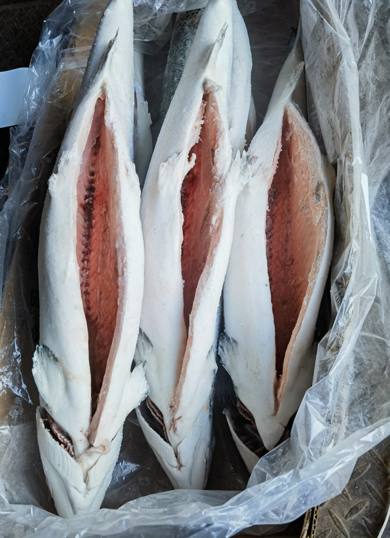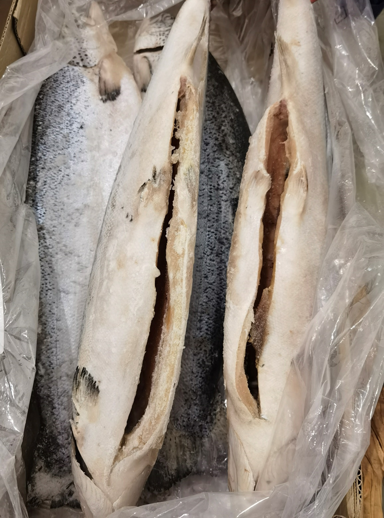 傳統冷凍工藝三文魚(上) 和采用螺旋式冷凍工藝三文魚(下)